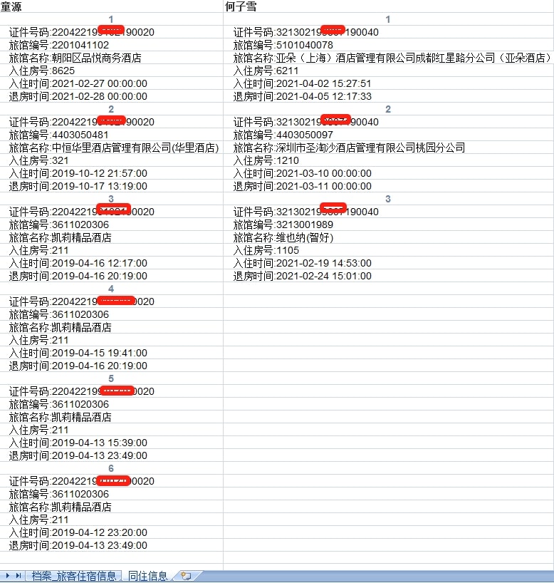 查询个人开房记录及同住人信息